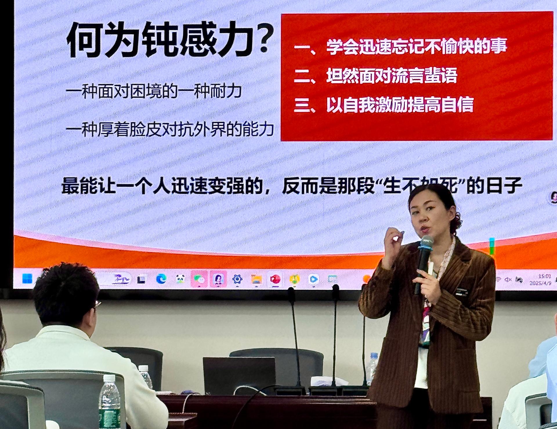 心理专家蒋丽娜老师为学员们讲授《阳光心态与压力管理》课程,引导学员树立积极心态,应对职场挑战,提升心理韧性,助力全面发展。