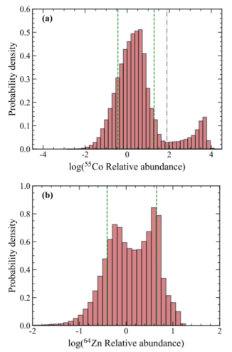 图1:⁵⁵Co与⁶⁴Zn丰度分布呈现多峰结构。绿色虚线表示68%置信区间